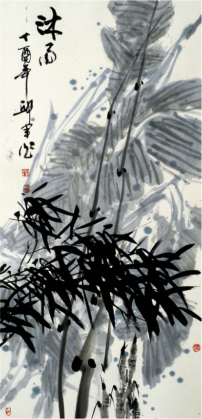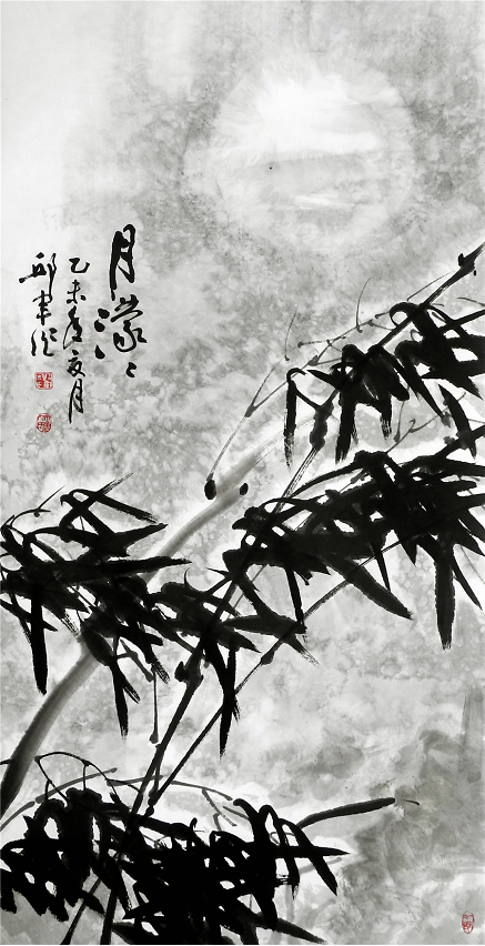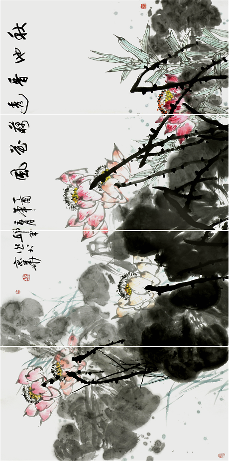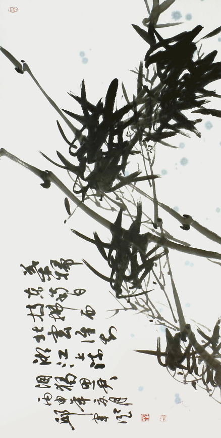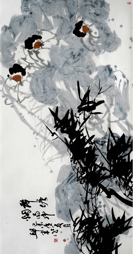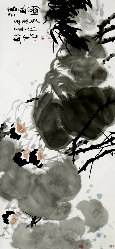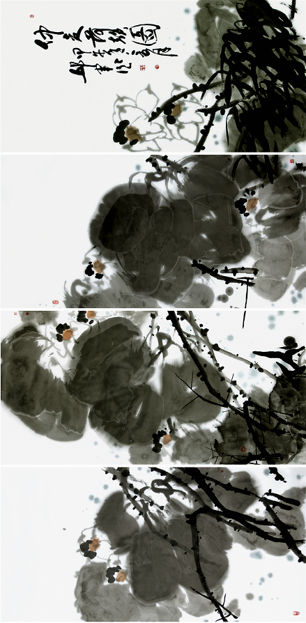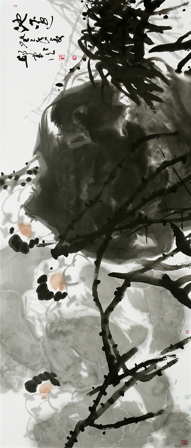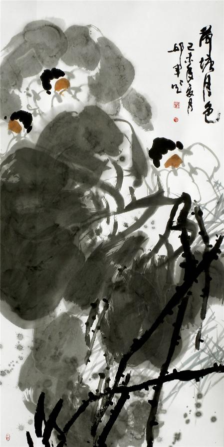 《仲夏荷韻圖》272cm×136cm惲南田云:“筆中之筆,墨外之墨,非高人逸品,不能得之,不能知之”。從中國(guó)寫意畫的筆墨能體悟出高品格,體現(xiàn)出東方藝術(shù)的獨(dú)特魅力,這也是中國(guó)畫與西方繪畫從形式到觀念上的巨大差異。邱君在章法、筆墨上苦下功夫,講究構(gòu)圖大的黑白對(duì)比與協(xié)調(diào),講究用筆的洗練和變化,講究墨色的濃淡關(guān)系,用筆與墨色的律動(dòng)與節(jié)奏,賦予了他作品以情趣和神韻。其用墨著色處處體現(xiàn)整體和諧、雅致的原則,對(duì)比鮮明,構(gòu)成強(qiáng)烈的視覺(jué)沖擊力,增強(qiáng)了畫作的藝術(shù)效果。墨色多是豐沛的,濕潤(rùn)的,盡顯空靈奇崛、寧?kù)o典雅之氣。從作品清凈、純真的格調(diào)看,作者創(chuàng)作時(shí)的心境是淡定和寧?kù)o的,沒(méi)有任何浮躁的情緒。