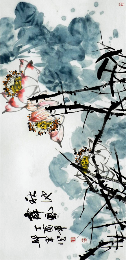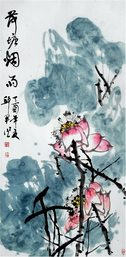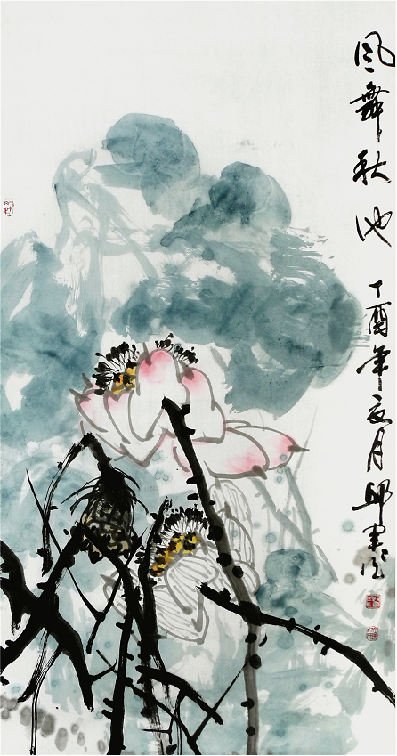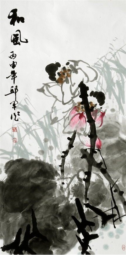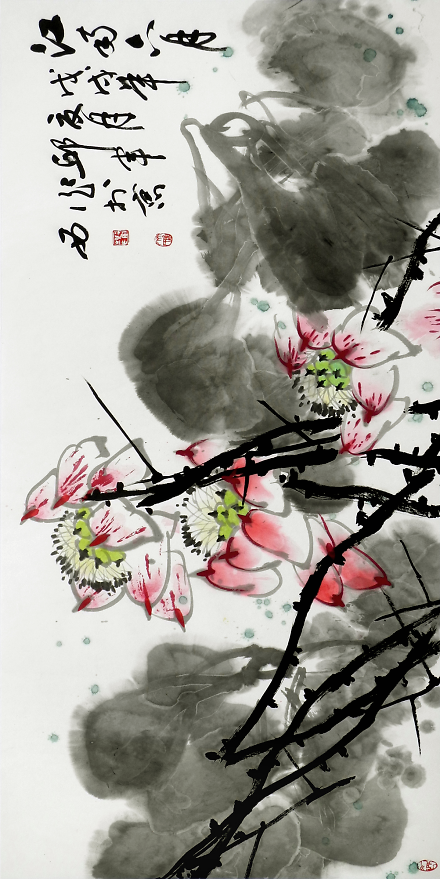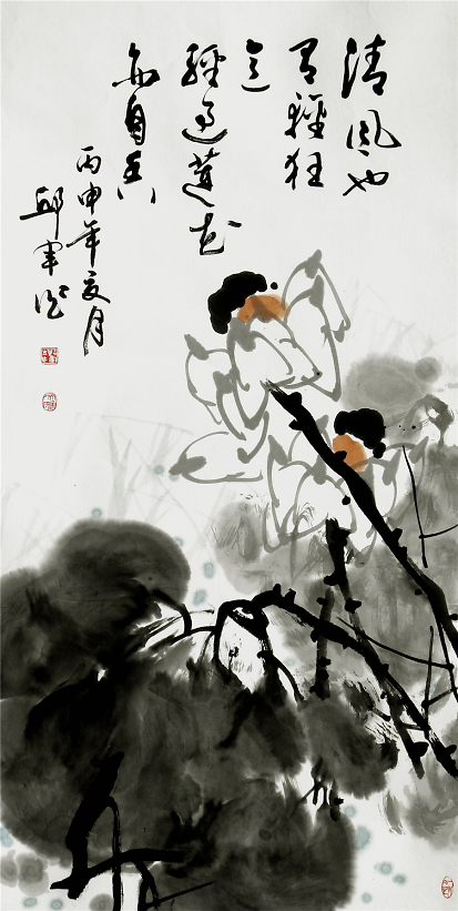 《秋池香透藕花風(fēng)》272cm×136cm邱君所作荷花正是形神兼?zhèn)渲钇?,他的作品不拘泥于傳統(tǒng)圖式,也非對(duì)客觀物象的描摹,其作清新典雅,內(nèi)斂蘊(yùn)籍,意境宏闊,意象豐富又渾然一體,讀之則有一股清新古雅的氣息撲面而來(lái)。其作氣息純正,空靈灑脫,大筆大墨且格調(diào)清純,使之于具象中超乎司空見(jiàn)慣的摹寫,生發(fā)出一種攝人心神和魂魄的藝術(shù)感召力。