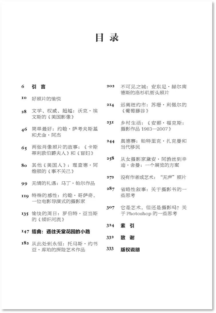 全書正文300多頁,除引言共包含17篇文章,每篇文章對(duì)應(yīng)一位影像藝術(shù)家或一種視覺現(xiàn)象。尤金·阿杰、約翰·薩考夫斯基、沃克·埃文斯、理查德·阿維頓、黛安·阿勃絲、馬丁·帕爾、約翰·哥薩奇、羅伯特·亞當(dāng)斯、托馬斯·約書亞·庫珀、安東尼·赫爾南德斯、蘇珊·利佩爾、安娜·??怂埂⑴撂乩锟恕ぴ寺?、辛迪·舍曼、安德烈亞斯·古斯基、杰夫·沃爾、格雷戈里·克魯森、拉克·德拉海爾等藝術(shù)家,均在格里·巴杰探討范圍之內(nèi)。