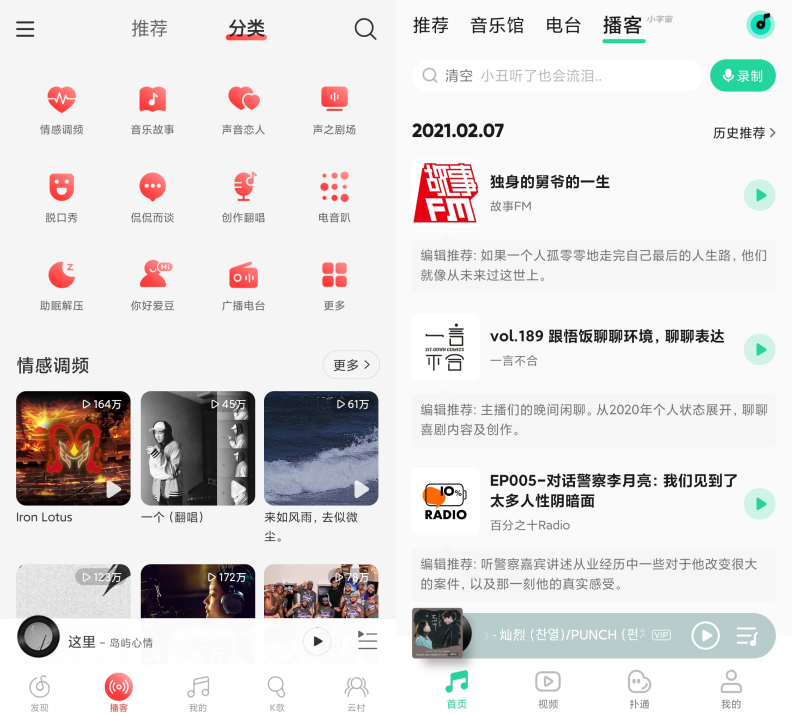 而老對(duì)手網(wǎng)易云則在首頁新增了“電臺(tái)”一欄,最新版本中也將“播客”升級(jí)為主APP一級(jí)功能頁。
