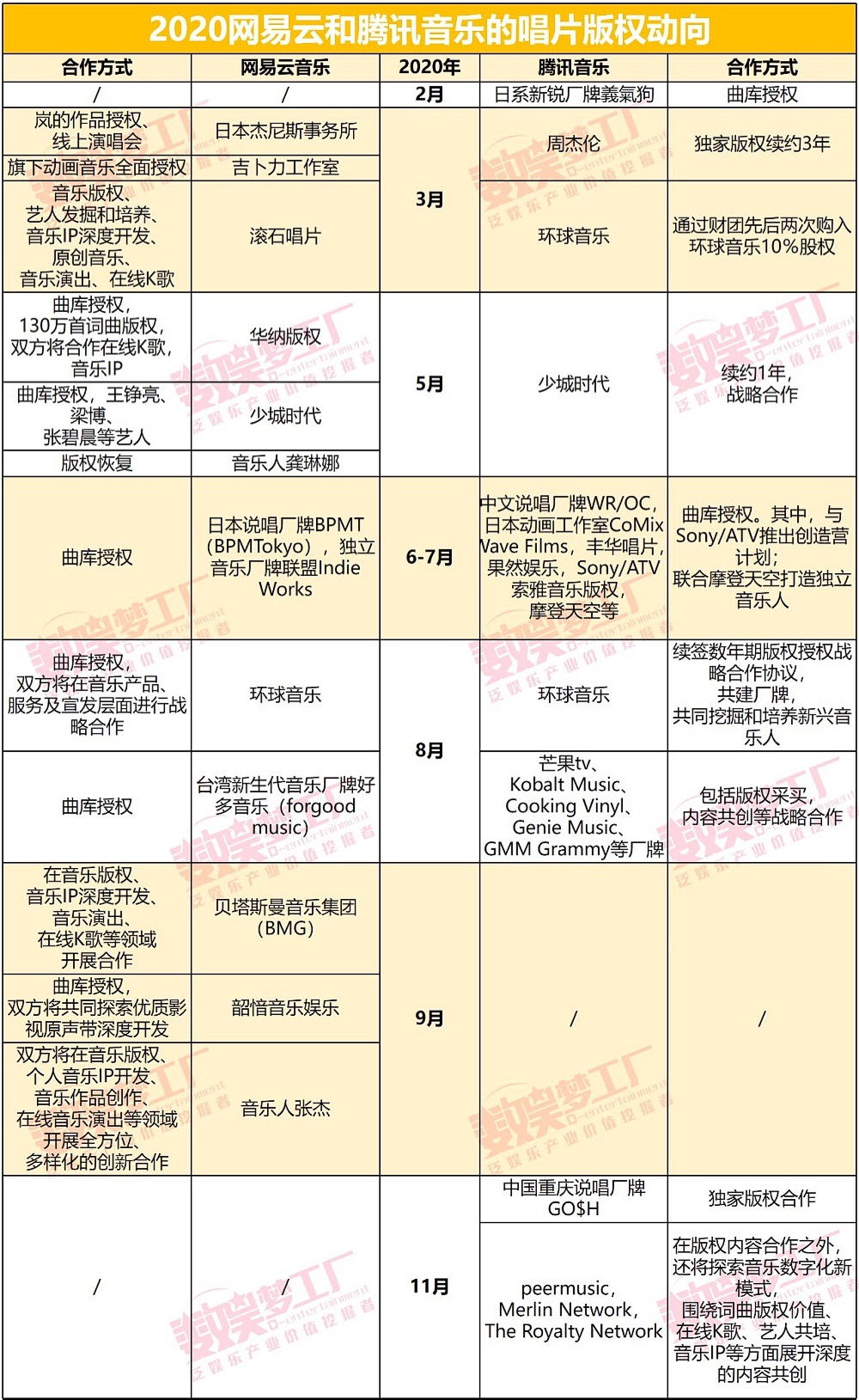 數(shù)娛君詳細(xì)梳理過去一年的版權(quán)宣布后注意到,雙方幾乎每個(gè)月都各有與上游版權(quán)方的簽約消息傳來,具體合作方式也從曲庫授權(quán)向戰(zhàn)略協(xié)作擴(kuò)展,在音樂人發(fā)掘、音樂IP開發(fā)等方面進(jìn)行深度綁定。