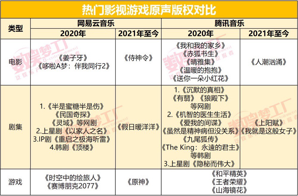 對(duì)于網(wǎng)劇、韓劇、電影甚至是游戲的音樂版權(quán),只要是熱門文娛內(nèi)容,雙方都沒有放過。