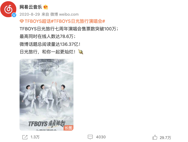 去年8月,TFBOYS“日光旅行”七周年演唱會(huì)獨(dú)家上線網(wǎng)易云,演唱會(huì)售票數(shù)量超過100萬張,打破線上付費(fèi)演唱會(huì)世界紀(jì)錄。