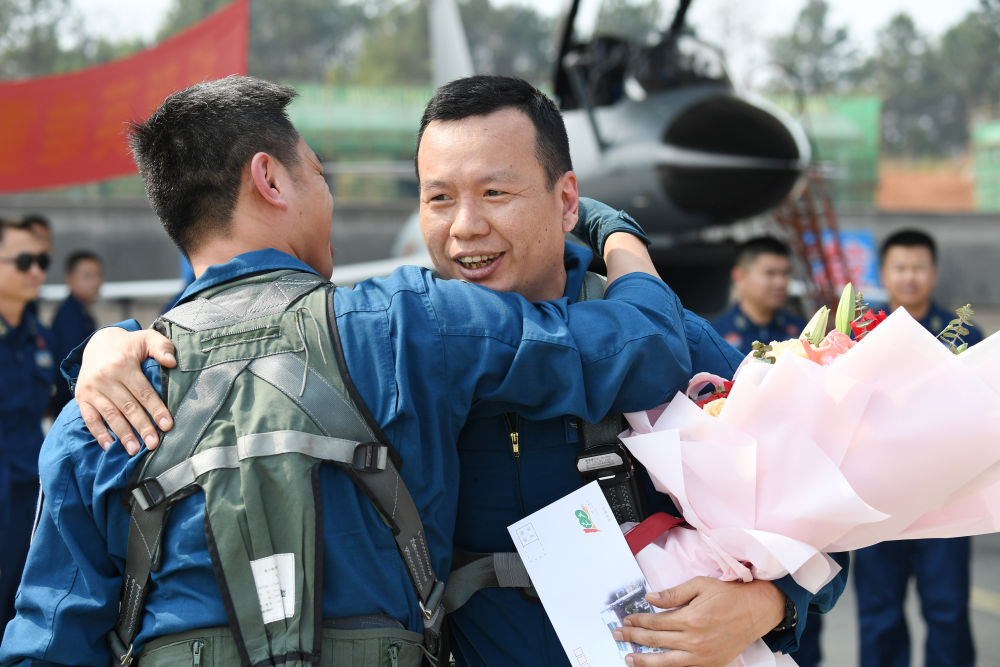 2月23日,復(fù)飛重返戰(zhàn)位的一等功空軍飛行員王建東完成飛行計(jì)劃后,與戰(zhàn)友擁抱慶祝。 唐俊 攝
