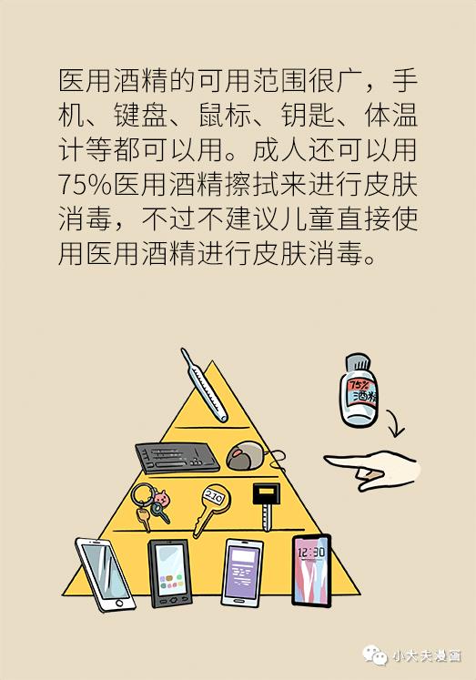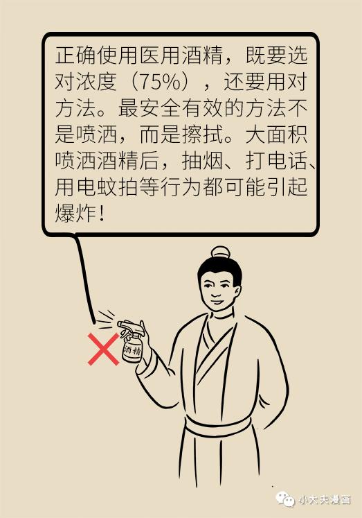 消毒用的酒精,一定要買醫(yī)用酒精。手機、鑰匙、鍵盤、鼠標(biāo)、體溫計及成人的皮膚消毒都可以用75%的醫(yī)用酒精。兒童不建議直接使用醫(yī)用酒精進(jìn)行皮膚消毒。酒精最有效的用法不是噴,而是擦拭。大面積地噴灑酒精,容易造成火災(zāi)。