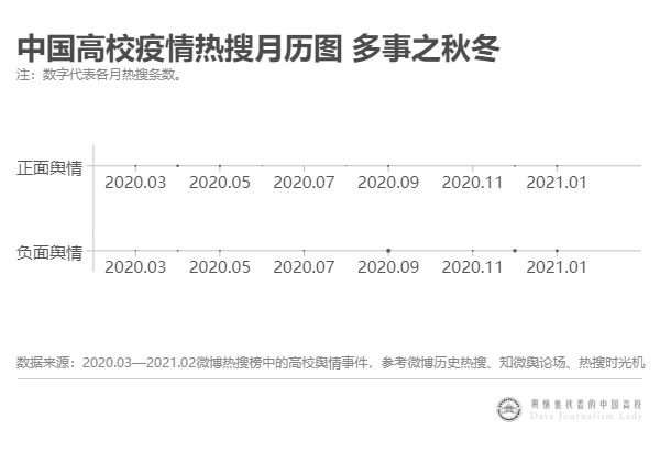 因為開學初體驗,2020年9月的高校疫情熱搜最多,共計21條;因為疫情又反復,4月(10條)、12月(17條)和次年1月(13條)也增加到兩位數(shù)。稍稍可以喘息的月份,多處在疫情穩(wěn)定或?qū)W生放假的時期,包括僅有1條熱搜的6月和8月,以及安然無事的10月和次年2月。