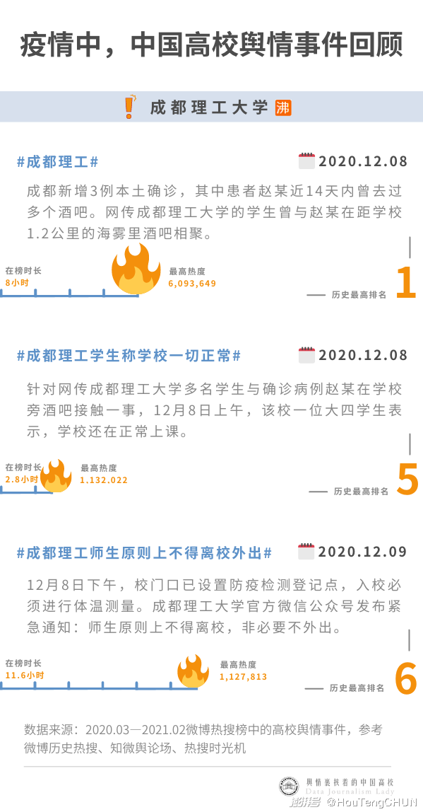 寒假前的2月里,四川和遼寧省高校的應對,提供了供我們探討的模板。12月7日,四川省成都市連續(xù)公布6例新冠肺炎確診病例,#成都理工大學多名學生與確診病例趙某在學校旁酒吧接觸#持續(xù)發(fā)酵,#成都理工#沖上熱搜第一。8日,校長辦公室一名劉姓工作人員告訴“澎湃新聞”,學校黨委宣傳部將對傳言統(tǒng)一發(fā)布聲明。當日,成都理工大學發(fā)布緊急通知,#師生員工原則上不得離校外出#再上熱搜。盡管高校未曾對網(wǎng)傳流言做出正面且及時的回應,但校方反應之快,當天的第3條熱搜#學生稱學校一切正常#或從側(cè)面反映校園管理的有序運行。這一天,成都理工大學三登熱搜,直升榜一,在榜共計22.4小時,累計最高熱度超800萬。