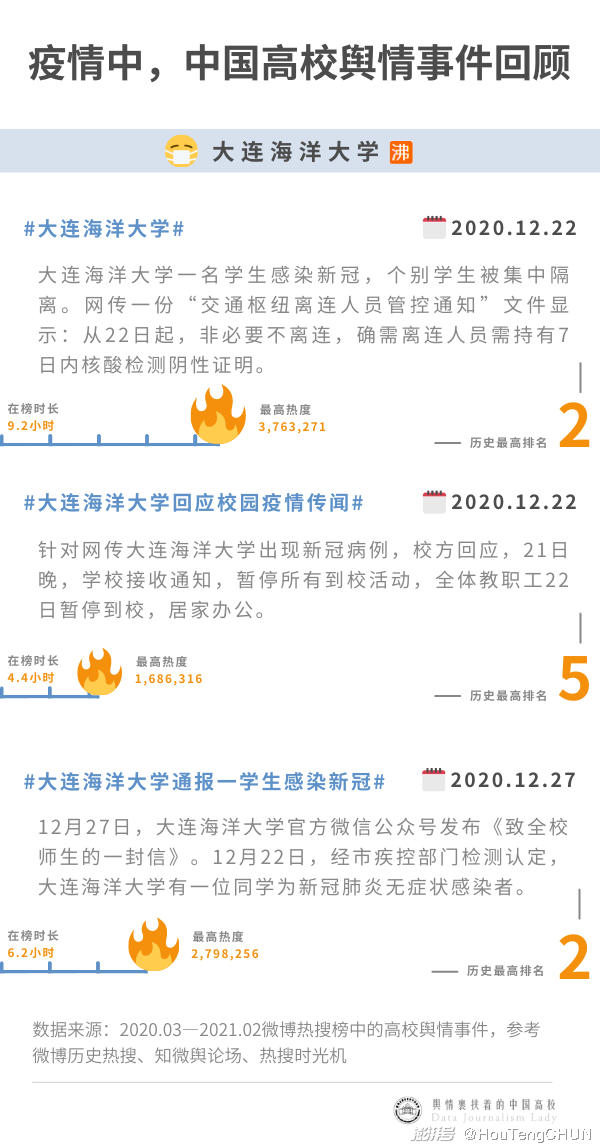 12月中旬,高校疫情的焦點,從西南轉(zhuǎn)向東北。15日,大連報告4例新冠肺炎無癥狀感染者。22日,#大連海洋大學#以全名沖上熱搜前三,#大連海洋大學回應校園疫情傳聞#和#大連海洋大學通報一學生感染新冠#接踵而至,官方公眾號發(fā)布的《致全校師生的一封信》確認了流傳5天的傳聞“一例陽性病例為考研學生”。這一月,大連海洋大學三登熱搜,最高排名第二,在榜共計20小時,累計最高熱度超800萬。