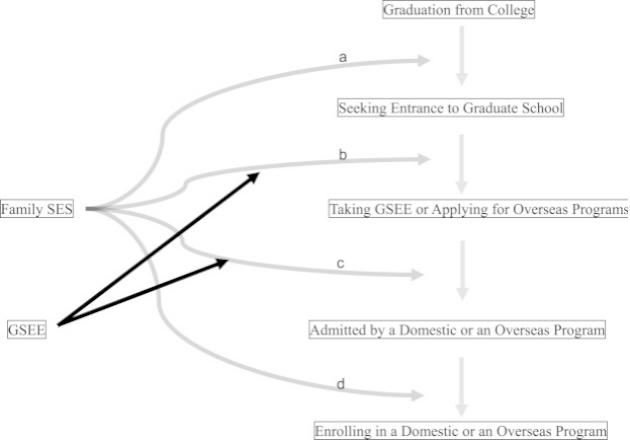 本研究的基本問題是家庭社會經(jīng)濟(jì)地位與研究生階段教育之間的關(guān)聯(lián),從大學(xué)畢業(yè)到研究生項目入學(xué)之間存在著如圖1所示的幾個過渡環(huán)節(jié)。