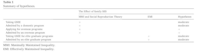 在教育持續(xù)不平等的研究中,MMI理論(Raftery and Hout,1993)和社會再生產(chǎn)理論指出:家庭社會經(jīng)濟(jì)地位與獲得研究生教育資格的機(jī)會呈正相關(guān)?;谶@一理論,優(yōu)勢學(xué)生將具有更大的以下傾向:(a)參加考研或申請海外項目;(b)更有機(jī)會被國內(nèi)或海外項目錄取。(在表1中用+號表示)與MMI理論相比,EMI理論(Lucas,2001)關(guān)注與特定教育項目的選擇性有關(guān)的橫向不平等,即富裕家庭的子女更可能通過參加頂尖項目來保持自己的階級優(yōu)勢。遵循這一理論的思想,家庭社會經(jīng)濟(jì)地位的影響對于頂尖研究生項目尤其重要(在表1中用+號表示)。但是由于中國的頂尖研究生項目也采用基于考試的錄取程序,研究假設(shè)它比申請海外項目更少地受到家庭背景的影響。