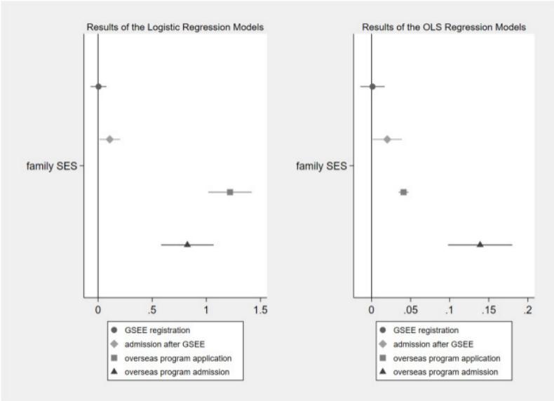 家庭社會經(jīng)濟(jì)地位在改變參加考研的可能性方面沒有發(fā)揮重要作用,但會在一定程度上提高被國內(nèi)項目錄取的可能性。對于那些申請海外項目的加權(quán)案例來說,家庭社會經(jīng)濟(jì)地位對申請海外研究生項目的傾向和獲得錄取的幾率均具有顯著的積極影響。此外,在95%置信區(qū)間下,家庭社會經(jīng)濟(jì)地位對海外研究生項目錄取幾率的影響系數(shù)明顯大于對國內(nèi)研究生項目被錄取幾率的影響系數(shù)。在這種情況下,在中國使用以應(yīng)試導(dǎo)向的標(biāo)準(zhǔn)進(jìn)行的評估可以削弱家庭背景的影響。(如圖2所示)
