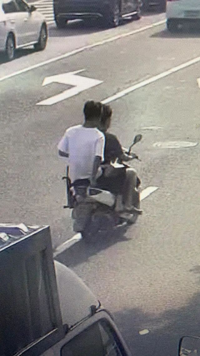 7月27日,監(jiān)控視頻中的兩名可疑男子。之后,王女士來(lái)到造貝路附近,從當(dāng)?shù)鼐用裉幍弥?,在造貝路與中山市坦洲鎮(zhèn)十四村交界處的立交橋下,有一流動(dòng)的狗肉攤位。
