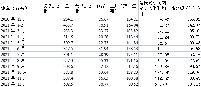 五大上市豬企2021年生豬銷量簡況 制表 彭艷秋