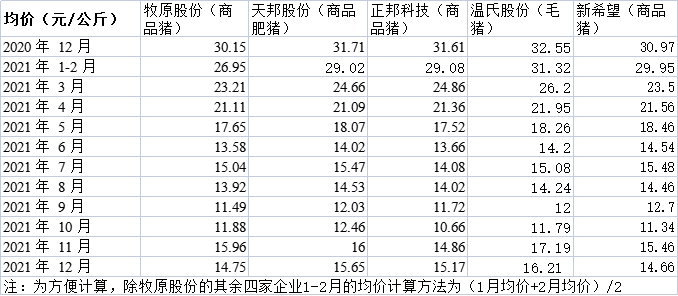 五大上市豬企2021年商品豬均價簡況 制表 彭艷秋