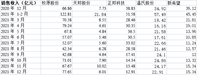 12月收入:牧原股份上漲,新希望持平,其余三家下降