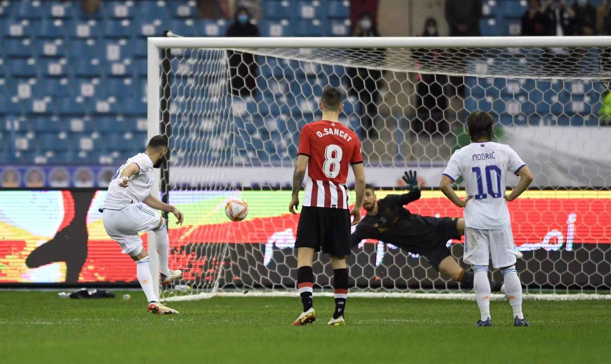 當(dāng)?shù)貢r間1月16日晚間,2021-22賽季西班牙超級杯決賽在沙特阿拉伯舉行,對決雙方是皇家馬德里與畢爾巴鄂競技。上半場比賽,莫德里奇遠(yuǎn)射破門為皇馬首開紀(jì)錄,下半場本澤馬造成耶賴禁區(qū)內(nèi)手球犯規(guī),并親自主罰點球命中。比賽最后階段米利唐手球犯規(guī)被紅牌罰下,畢爾巴鄂競技也獲得點球機(jī)會,但勞爾·加西亞主罰的點球被庫爾圖瓦撲出。最終皇馬以2-0擊敗畢爾巴鄂競技,奪得21-22賽季西班牙超級杯冠軍,這是皇馬隊史第12次奪得這一榮譽(yù)。