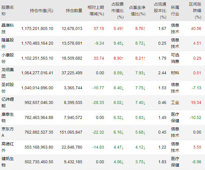 前十大重倉(cāng)股分別是:晶澳科技(002459)、隆基股份(601012)、小康股份(601127)、龍佰集團(tuán)(002601)、圣邦股份(300661)、億緯鋰能(300014)、康泰生物(300601)、京東方A(000725)、高德紅外(002414)、健帆生物(300529)。