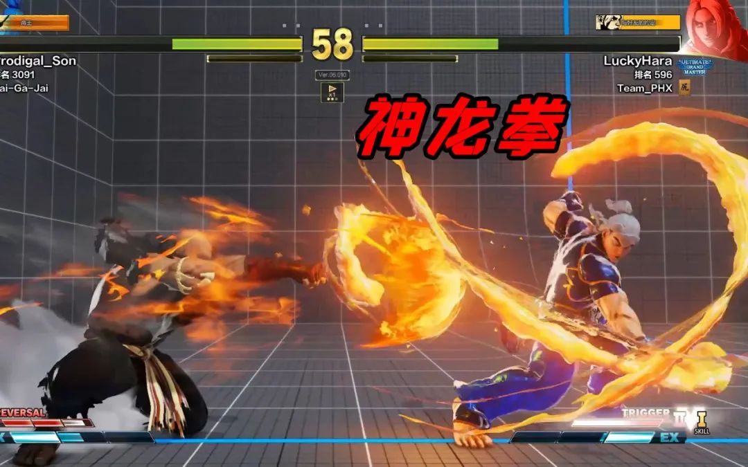 關(guān)于神龍拳(Hurricane)的操作方式:以左手虎口銜住搖桿,仿佛逆時(shí)鐘三點(diǎn)至十點(diǎn)半,畫一道一百三十五度左右的弧,畫弧同時(shí)右手瞬間按下“重拳”之鈕,熒幕里的Ru便會(huì)嘶喊著“hou——liu——kian——!”舉拳朝天擎飛而起。攻擊系數(shù)三成三三。防御系數(shù)二成五。若是畫弧同時(shí)右手按下“重腳”之鈕,則是Ru劈腿在空中打螺旋槳一般的“旋風(fēng)腿”。不過(guò)中看不中用,攻擊系數(shù)只有兩成。防御系數(shù)低至零點(diǎn)五成。搖桿若是由九點(diǎn)方位至四點(diǎn)半方位同樣逆時(shí)鐘畫一道一百三十五度之弧,右手按“重拳”鈕或“輕拳”鈕,則是在第一代快打叱咤一時(shí)的“氣功”,一團(tuán)白色的氣功Ru在一招“亢龍有悔”式的雙掌中拍出,第二代攻擊系數(shù)被壓低,只有一成。防御系數(shù)仍高達(dá)五成。