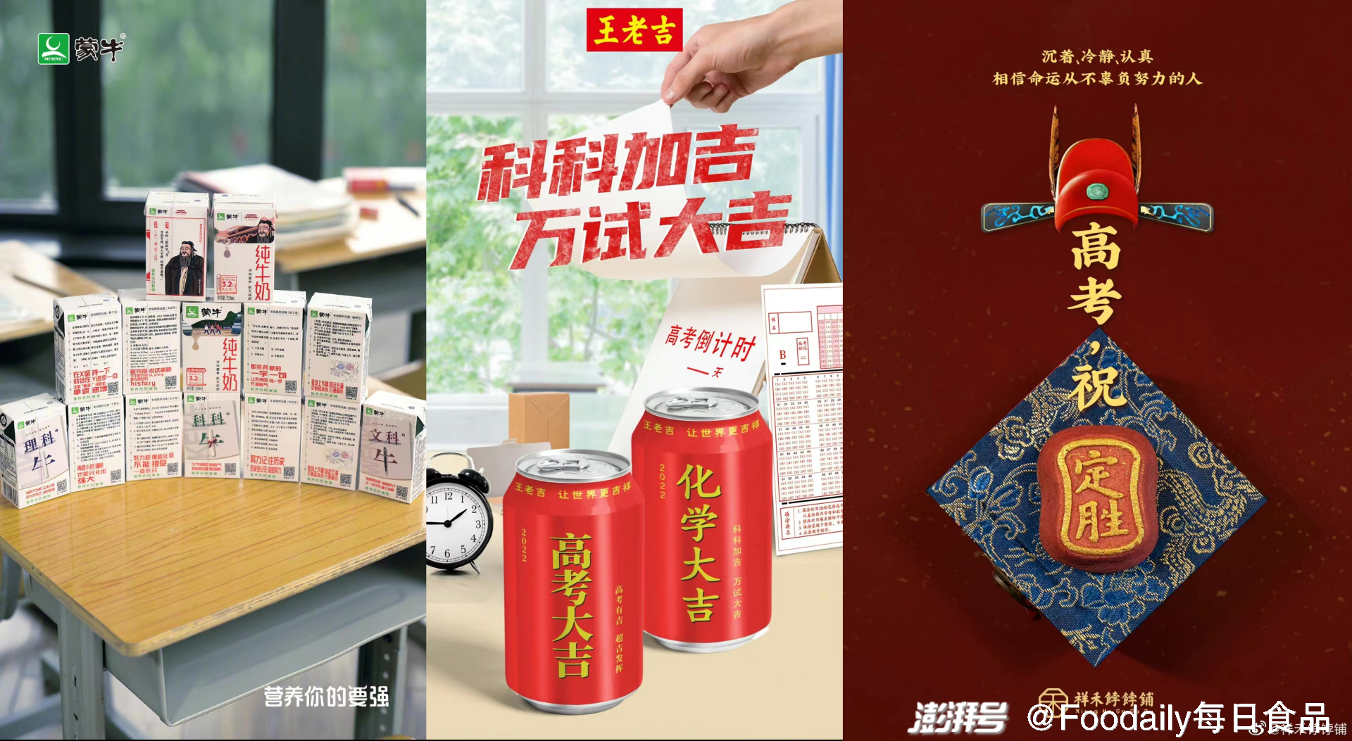 如在食品行業(yè),蒙牛就推出過“高考押題奶,王老吉推出了“高考大吉罐”,六個核桃在高考倒計時100天的時候推出了“孔廟祈福罐”,一些老字號中式糕點品牌則推出了“定勝糕”,用美好寓意為考生們討彩頭。