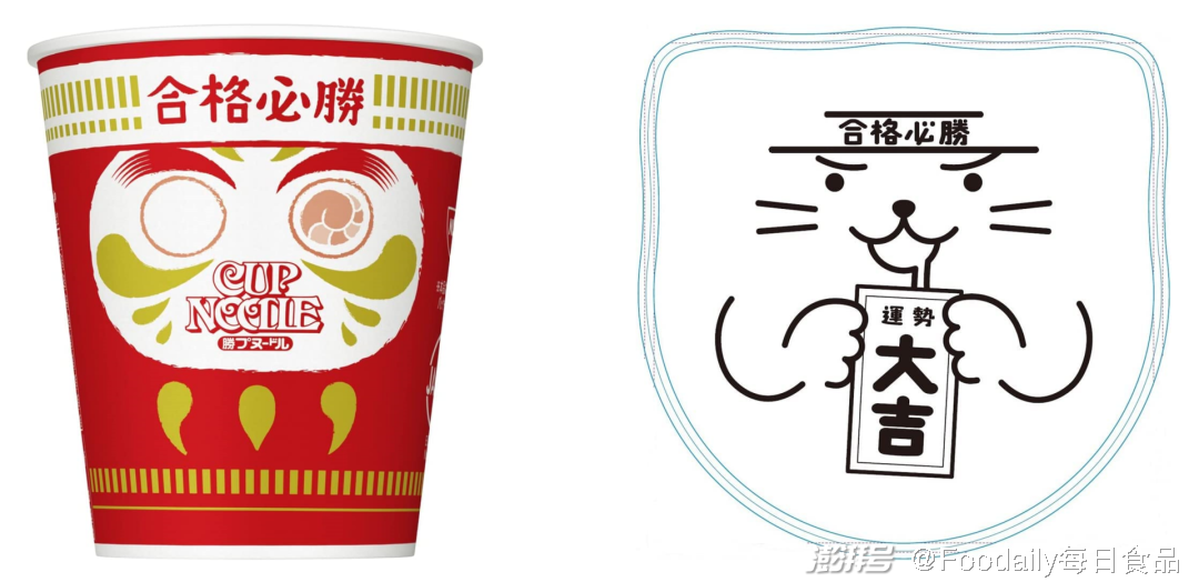 如樂天發(fā)售的考拉餅干,用考拉即使在樹上睡著也絕不會掉落的樣子來??忌^不會落榜,日清則直接簡單粗暴地在泡面外包裝上印了“合格必勝”和象征吉祥的達摩,并在包裝背面印上了拿著“大吉”簽的貓咪圖案,為學(xué)習(xí)間隙的考生提供一點治愈。