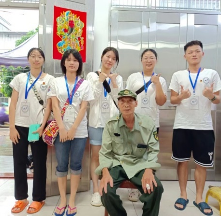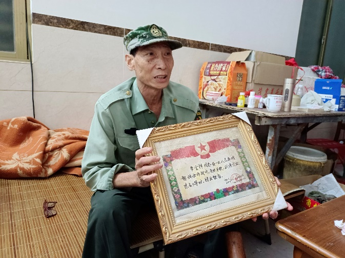 2022年7月3日,“風(fēng)啟”社會實(shí)踐隊研揚(yáng)調(diào)研組對茂名市電白區(qū)陳村的黨員家庭進(jìn)行采訪。當(dāng)經(jīng)過一居民樓門口時,發(fā)現(xiàn)門口上掛有“共產(chǎn)黨員家庭”、“光榮之家”和“參戰(zhàn)退役軍人”光榮牌,這在陳村中屈指可數(shù)。調(diào)研組成員喜出望外,跨過門欄,映入眼簾的便是一位身穿軍裝的爺爺。他坐在自己的小榻上,視線相對之際,爺爺眼神中透露出一份堅毅,骨感的臉龐顯得自然平和。