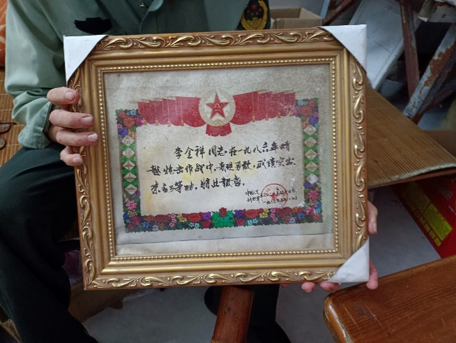 李金祥爺爺參加過對越自衛(wèi)反擊戰(zhàn)并獲得三等功,他在敘述這段經(jīng)歷的時候,微微笑的臉頰中看出了一個退伍軍人對于曾經(jīng)能夠保護(hù)祖國的驕傲與榮譽(yù)。泛黃的獎狀記錄了李金祥爺爺在自衛(wèi)反擊戰(zhàn)的英勇事跡,讓大家震撼不已,感觸頗深。
