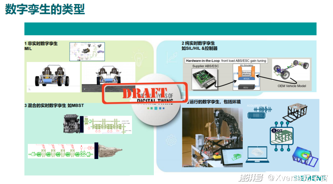 對(duì)于制造業(yè)來(lái)說(shuō),數(shù)字孿生有四大類型,第一類是非實(shí)時(shí)數(shù)字孿生,從控制的角度來(lái)講,叫模型在環(huán);第二類是純實(shí)時(shí)的數(shù)字孿生,如SIL/HIL &控制器;第三類是混合的實(shí)時(shí)數(shù)字孿生,如MBST;最后一類是可運(yùn)行的數(shù)字孿生。