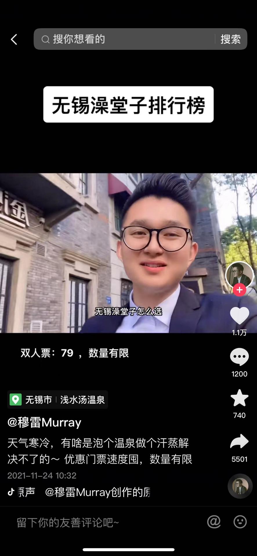這來源于穆雷的偶然發(fā)現(xiàn)。疫情后,外出旅游受限,當(dāng)穆雷把無錫的景區(qū)輪番介紹一遍后,機(jī)緣巧合地推介了一家洗浴店,意外發(fā)現(xiàn)反響特別好,評(píng)論區(qū)討論熱烈,他推薦的平價(jià)團(tuán)購套餐也受到熱捧。