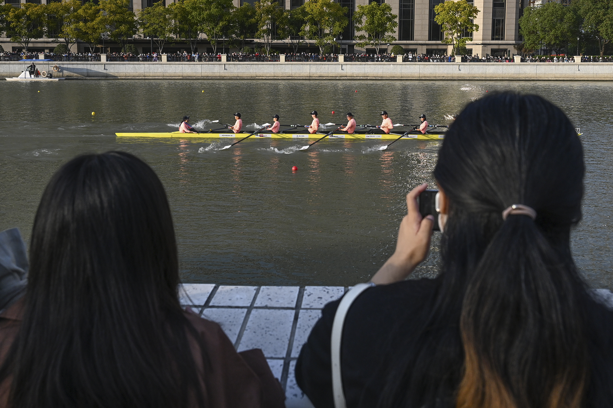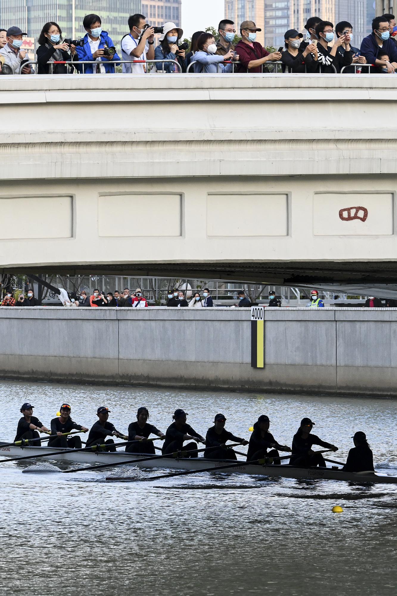 澎湃新聞?dòng)浾咄ㄟ^一組照片直擊蘇州河上賽艇盛況。