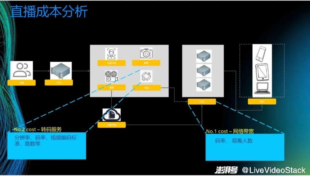 接下來(lái)進(jìn)行直播成本分析。這是一張直播的結(jié)構(gòu)圖,主播上傳內(nèi)容到上行CDN,然后再發(fā)送到轉(zhuǎn)碼中心進(jìn)行內(nèi)容識(shí)別、截屏、錄制和轉(zhuǎn)碼,接著再分發(fā)到下行CDN。這個(gè)過(guò)程中,成本最大的是網(wǎng)絡(luò)帶寬和轉(zhuǎn)碼服務(wù)器。之前提到,網(wǎng)絡(luò)帶寬取決于觀看人數(shù)和碼率。舉個(gè)例子,觀看2M的視頻和觀看500K的視頻所需的網(wǎng)絡(luò)帶寬不同,1000個(gè)人同時(shí)觀看視頻和10個(gè)人同時(shí)觀看視頻所需的網(wǎng)絡(luò)帶寬也不同。轉(zhuǎn)碼服務(wù)取決于分辨率、碼率和視頻編碼標(biāo)準(zhǔn)等。