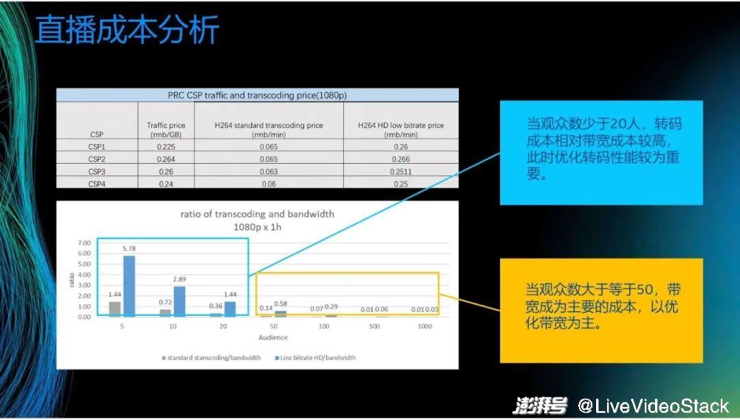我們對(duì)頭部的互聯(lián)網(wǎng)廠商進(jìn)行了分析。如第一張圖所示,主要有兩個(gè)成本,一個(gè)是Traffic price,即帶寬成本,另一個(gè)是轉(zhuǎn)碼成本。第二張圖表示直播一小時(shí)內(nèi),轉(zhuǎn)碼和帶寬的比例,圖的橫軸是觀看人數(shù),縱軸是轉(zhuǎn)碼和帶寬費(fèi)用的比例。可以看到,當(dāng)觀眾數(shù)大于等于50時(shí),帶寬成為主要的成本。舉個(gè)例子,頂級(jí)流量主播的一場(chǎng)直播的帶寬成本要幾百萬(wàn),此時(shí)轉(zhuǎn)碼成本只有幾千塊,相對(duì)帶寬成本幾乎可以忽略。但對(duì)于數(shù)量眾多的小主播來(lái)講,觀眾數(shù)可能只有十幾個(gè),此時(shí)的帶寬較低,所以轉(zhuǎn)碼成本成為主要的成本。針對(duì)這兩種情況,在帶寬成本較大時(shí),我們以優(yōu)化帶寬為主,在轉(zhuǎn)碼成本較大時(shí),我們以優(yōu)化轉(zhuǎn)碼速度/轉(zhuǎn)碼性能為主。
