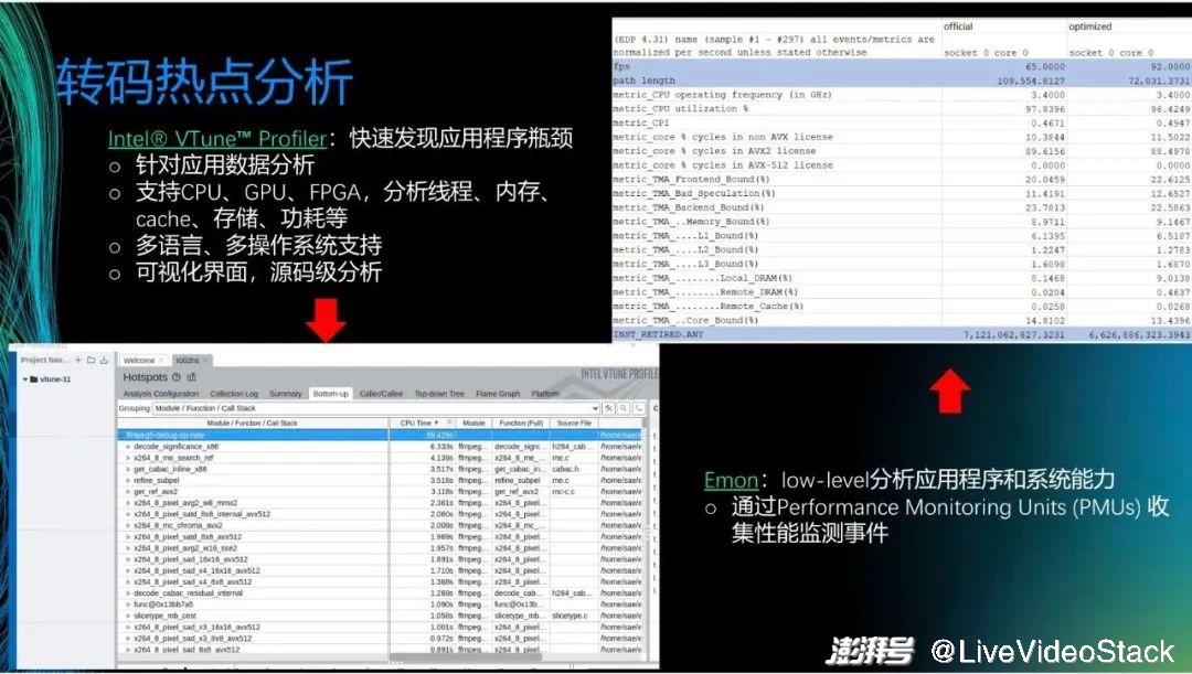 接下來(lái),介紹幾款好用的英特爾的工具。首先是V-Tune,是一個(gè)可以快速發(fā)現(xiàn)應(yīng)用程序瓶頸的可視化的工具。左下圖展示了一個(gè)例子,可以看到,我們可以知道轉(zhuǎn)碼里每個(gè)函數(shù)占用的CPU時(shí)間,雙擊就可進(jìn)入code,精確定位哪行code的占比較高,所以可以清楚地知道熱點(diǎn)函數(shù)在哪里。我們支持CPU、GPU和FPGA,也支持多語(yǔ)言和多操作系統(tǒng)。V-Tune的優(yōu)點(diǎn)是直觀,缺點(diǎn)是會(huì)為系統(tǒng)帶來(lái)一定的負(fù)擔(dān)。