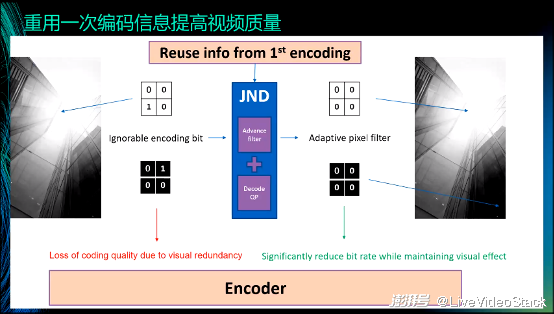舉個(gè)例子說(shuō)明如何重用一次編碼的信息來(lái)提高視頻質(zhì)量。JND是一種感知編碼技術(shù),在左上的圖中,四個(gè)block中只有左下的block的值為1,其余block的值為0。但對(duì)于人眼來(lái)說(shuō),可以忽略數(shù)值1,即四個(gè)block的值可以都為0。這是JND的核心思想:過(guò)濾人眼感觸不到的信息。對(duì)此,經(jīng)典的方法是使用雙邊濾波器等進(jìn)行過(guò)濾,但這些方法都是無(wú)差別的濾波,容易造成“誤傷”。而現(xiàn)在由于掌握一次編碼信息,我們知道哪些信息可以被平滑,哪些信息必須保留,通過(guò)設(shè)置權(quán)重的方式來(lái)進(jìn)行“區(qū)別對(duì)待”。這樣做可以帶來(lái)兩個(gè)好處,一是可以提高主觀視覺(jué)的質(zhì)量,二是在限定碼率的情況下,可以將碼率用在刀刃上,大幅度地提高客觀質(zhì)量。比如,將一個(gè)原碼率是50Mbps的視頻轉(zhuǎn)碼為2Mbps的視頻,采用我們的方式就可以較大地提高質(zhì)量。