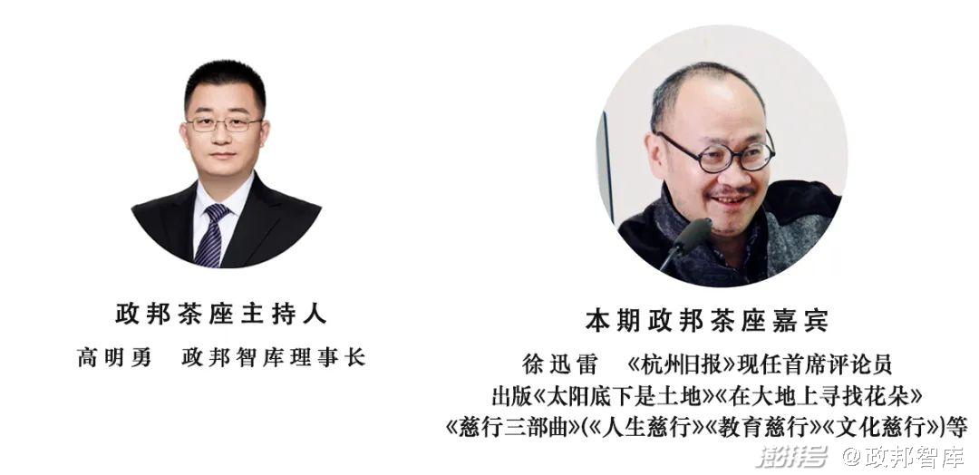 本期政邦茶座嘉賓:徐迅雷,《杭州日報(bào)》評論部原主任,現(xiàn)任首席評論員;浙江大學(xué)傳媒與國際文化學(xué)院兼任專家;中國作家協(xié)會會員、浙江省雜文學(xué)會副會長、杭州市文藝評論家協(xié)會副主席;已出版《太陽底下是土地》《在大地上尋找花朵》《知知而行行》《中國雜文(百部)·徐迅雷集》等著作20多部,其中在廣西師范大學(xué)出版社出版11部,包括新著《慈行三部曲》(《人生慈行》《教育慈行》《文化慈行》。