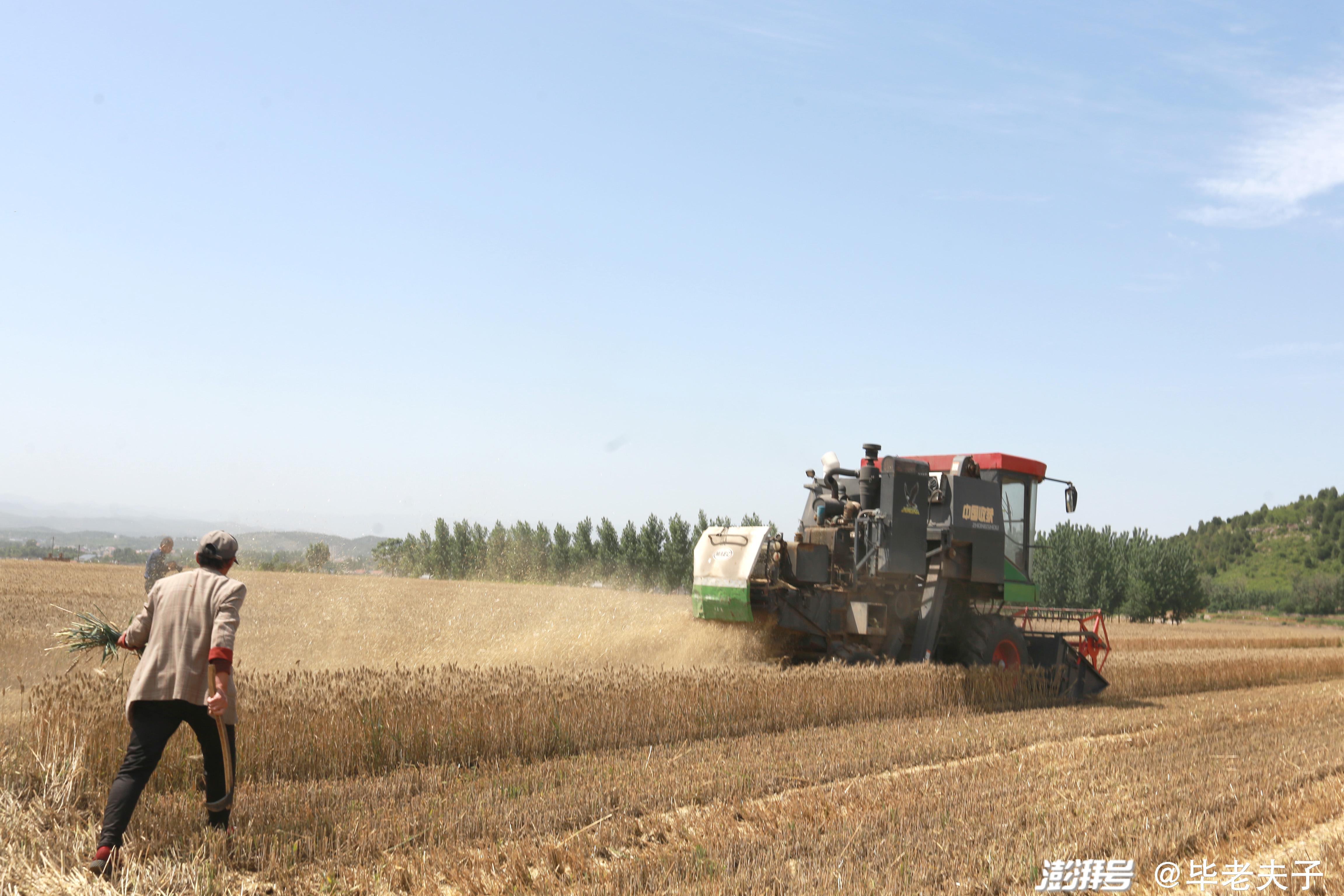 機手正在為閆莊明的麥田收割,這是閆老漢家一個小地塊兒,面積僅一畝半。