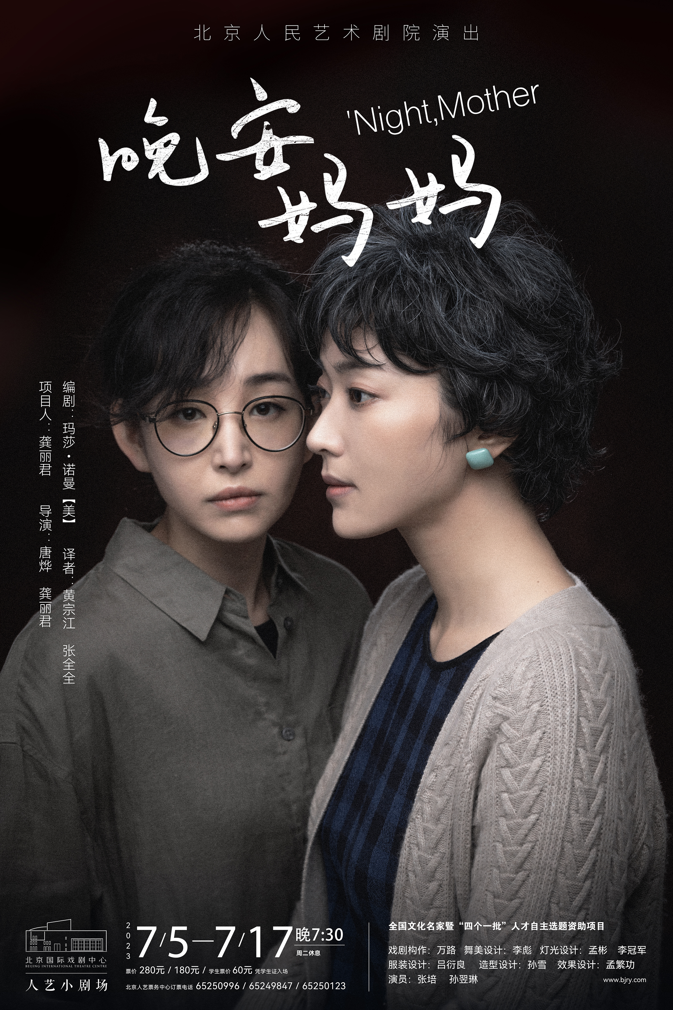 龔麗君:《晚安,媽媽》是全國文化名家暨“四個一批”人才自主選題資助項目,可以說是國家專項計劃,是全國宣傳思想文化領(lǐng)域最高層次的綜合類文化人才培養(yǎng)工程。我呢,在北京人藝工作了三十多年,算是在話劇藝術(shù)領(lǐng)域小有成就,入選了這個項目。國家給的資金,可以出書、出碟。我還是想用這筆錢排一部戲,就和(時任)院長任鳴商量,本著量入為出的原則,排一部小劇場的話劇。2017年資金到位,使用時限是在五年內(nèi)。2021年年底、2022年年初,我就想再不做就沒機會了,選擇了這個劇本。