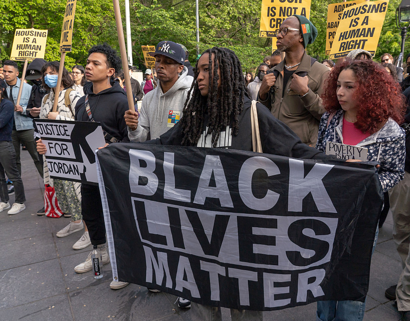 當(dāng)?shù)貢r(shí)間2023年5月5日,美國(guó)紐約,在華盛頓廣場(chǎng)公園舉行的“為喬丹·尼利伸張正義”集會(huì)上,一名婦女舉著“黑人的命也是命”橫幅。