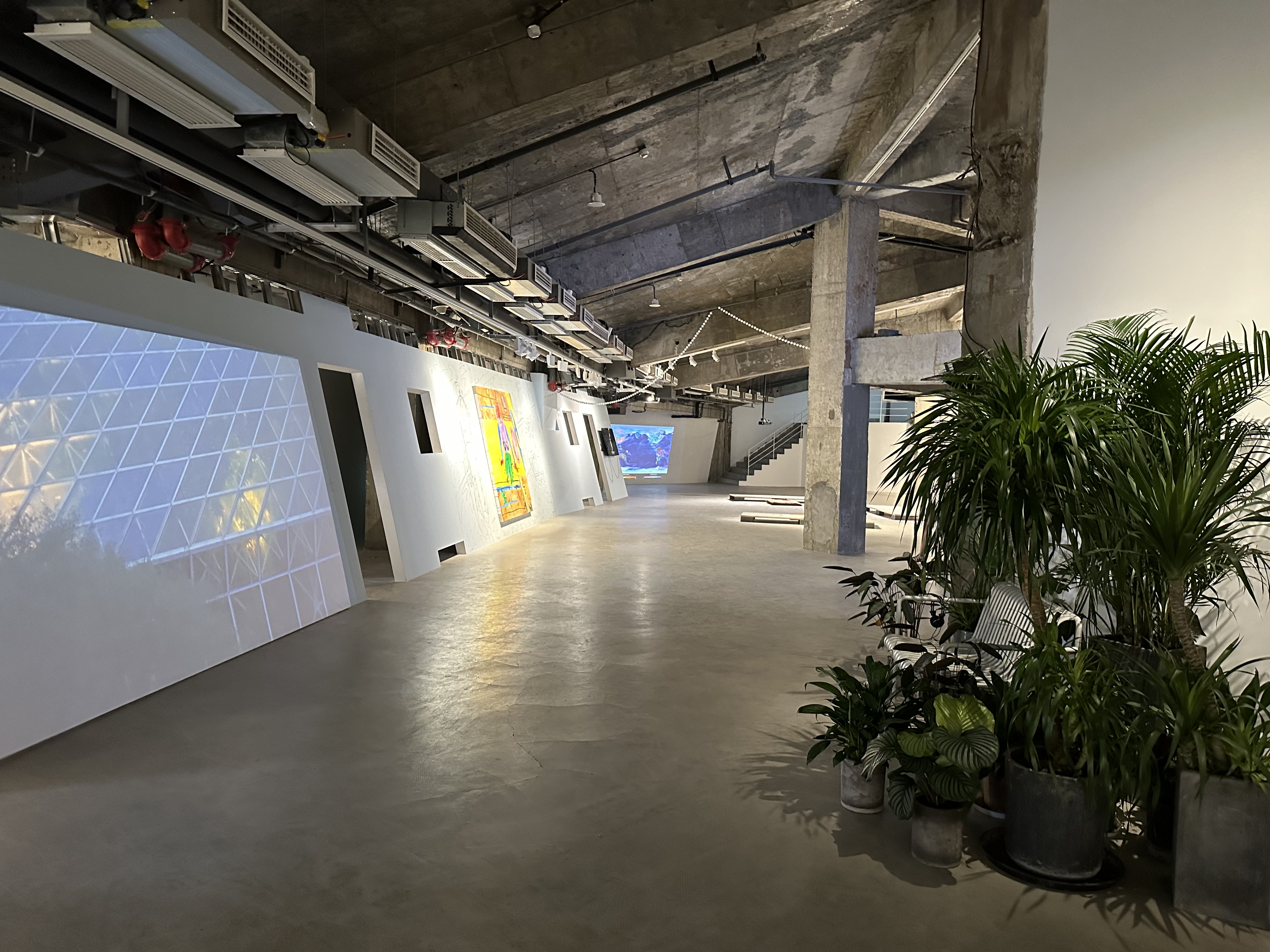 另一位策展人建筑師楊乃天則對(duì)曾經(jīng)用于民防工程的美術(shù)館空間進(jìn)行梳理和對(duì)話,通過(guò)展廳中臨時(shí)新建的一組斜墻,將天、屋頂和地面緊密連接,營(yíng)造出撲面而來(lái)的緊迫張力。有斜度的墻暗喻著大氣給人的感覺(jué),時(shí)而壓抑時(shí)而歡快。墻體上的各種孔洞,在強(qiáng)化景深的同時(shí)制造出作品與觀眾體驗(yàn)的非線性敘事。