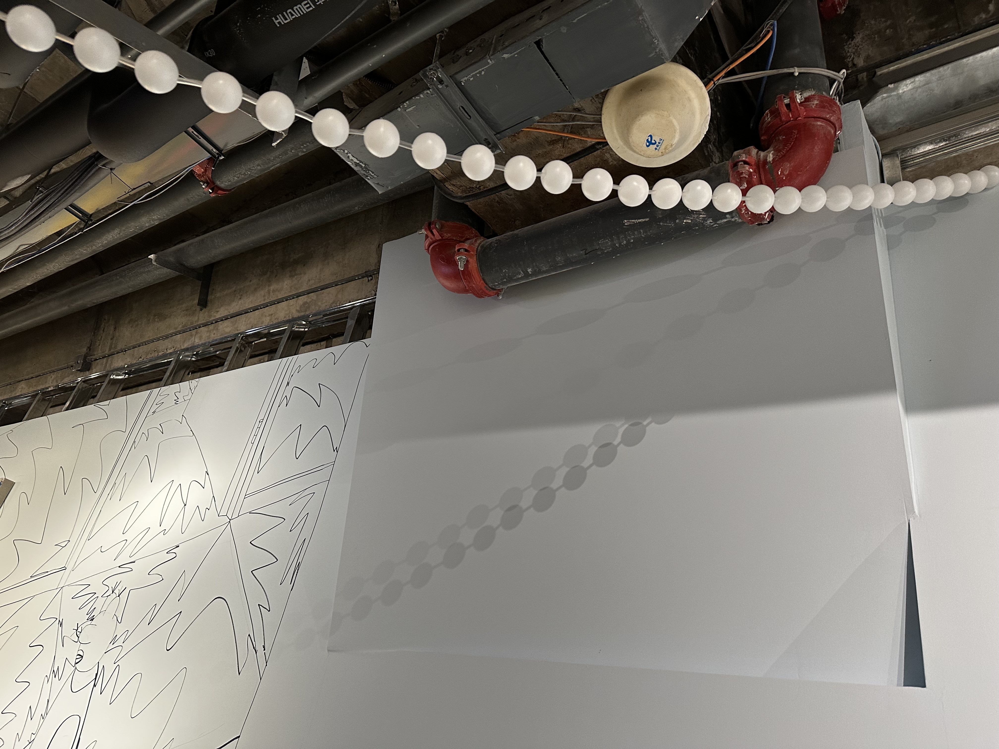 天氣云圖中一般使用點(diǎn)狀虛線來(lái)示意冷暖空氣交匯面形成的雨帶,在展場(chǎng)中,策展人巧用白色乒乓球連成串來(lái)實(shí)體化這個(gè)看不見(jiàn)也摸不著的交匯面。觀眾走過(guò)的風(fēng)會(huì)帶起乒乓球串的運(yùn)動(dòng),從而感知到無(wú)形的“氣”的運(yùn)動(dòng)。天氣如斯,人、自然、萬(wàn)物和氣候互相影響,危與機(jī)也蘊(yùn)藏在每一瞬的氣候變化之中。