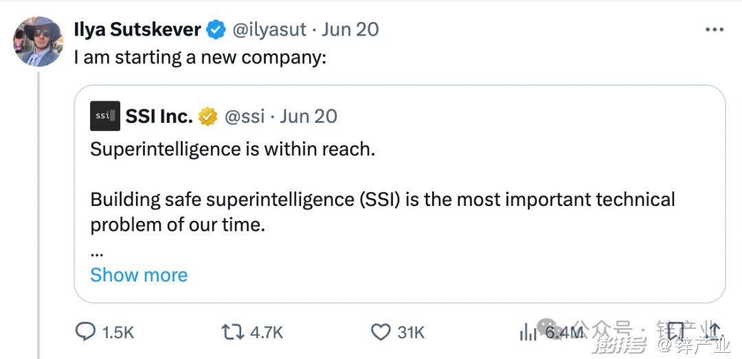 其一是前OpenAI聯(lián)合創(chuàng)始人、首席科學(xué)家Ilya Sutskever最近離職創(chuàng)業(yè)了,做了一家名為Safe Super intelligenceinc(SSI)的公司。