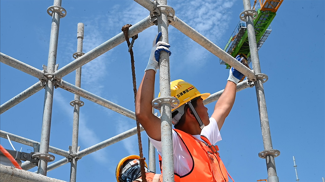 我做架子工,主要是負(fù)責(zé)施工現(xiàn)場的臨邊圍護(hù),還有腳手架、支模架的搭設(shè)這些。其實(shí)夏季的挑戰(zhàn)是最大的。本身在搬運(yùn)鋼管、搭建架子這些過程中,體力勞動(dòng)的付出就比較多,而且我們搭腳手架一般都在室外,頭頂沒有遮擋?,F(xiàn)在這樣的高溫天氣里,鋼管的溫度比氣溫還要高出好幾度。盡管工作時(shí)間已經(jīng)避開了高溫時(shí)段,但我在工作的時(shí)候隔著手套,還是會(huì)感受到鋼管的燙手。溫度上來了,搬運(yùn)和搭建的難度就都增加了。