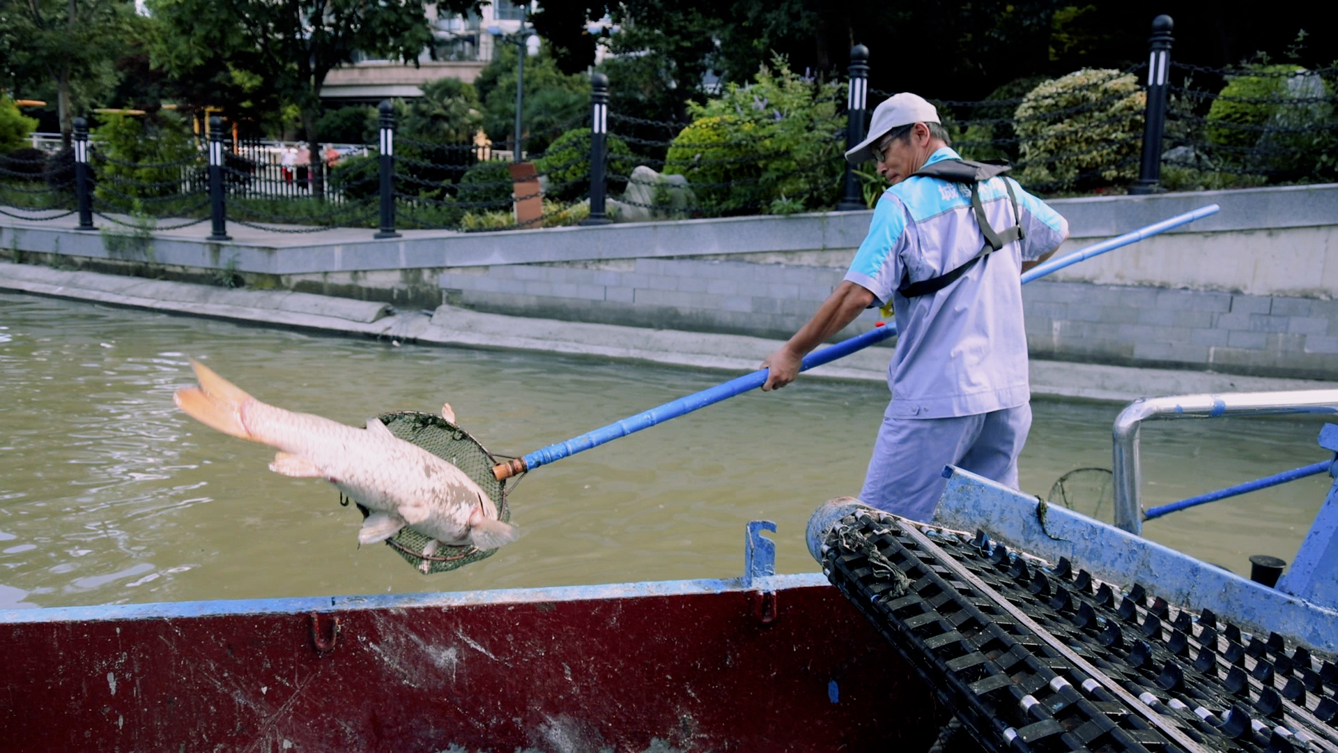 夏季,有些死魚真的很難搞。每逢初一、十五,沿岸有些居民放生魚類,隨著氣溫升高,因?yàn)槿毖?,死魚就會(huì)多起來,我們只能盡量清理干凈。