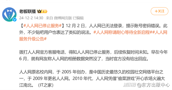 近日,“人人網(wǎng)已停止服務(wù)”的消息上了熱搜,網(wǎng)友們發(fā)現(xiàn)承載著一代人青春回憶的人人網(wǎng)突然無(wú)法登錄,這一事件迅速引發(fā)了廣泛關(guān)注。