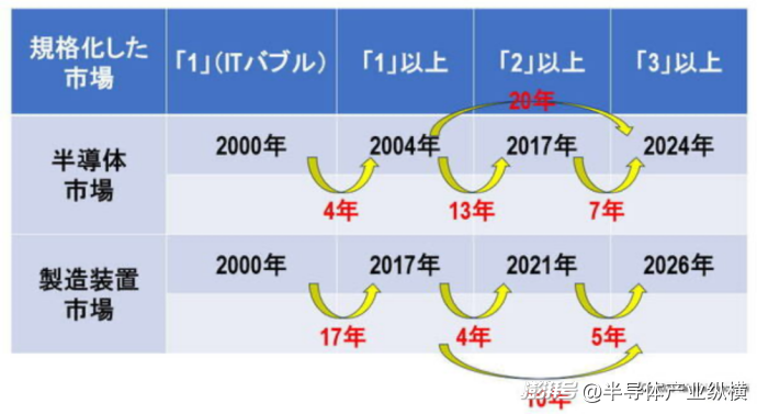 首先,半導(dǎo)體市場在IT泡沫破裂4年后的2004年超越了“1”,在2013年后的2017年超越了“2”。然后,七年后,即 2024 年,它超越了“3”。雖然半導(dǎo)體市場從IT泡沫后的低迷中迅速復(fù)蘇,但達(dá)到“2”的時間仍比預(yù)期要長。