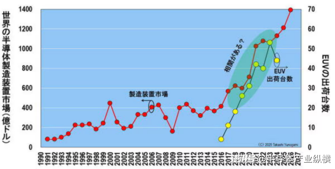 如果我們將全球制造設(shè)備市場和 EUV 出貨量疊加在同一張圖表上,那么從 2019 年到 2023 年,兩者的趨勢似乎幾乎相同(圖 4)。因此,人們認(rèn)為EUV的普及正在推動設(shè)備市場的快速擴(kuò)張。