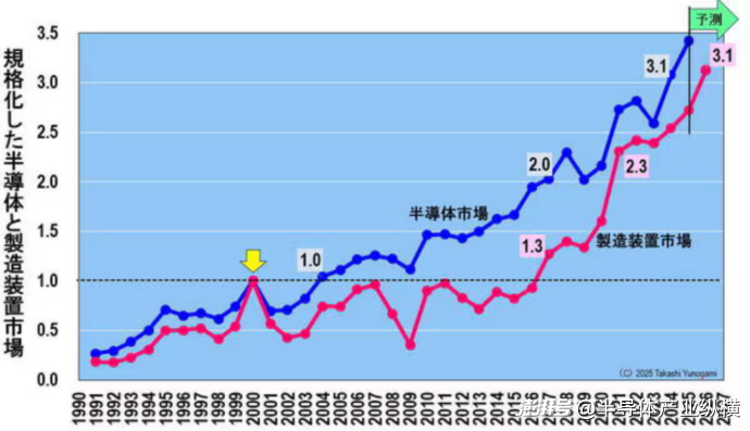 半導(dǎo)體市場在2000年達(dá)到頂峰后曾一度下滑,但很快恢復(fù),并在2004年超過“1”。2017年突破“2”,2024年突破“3”。