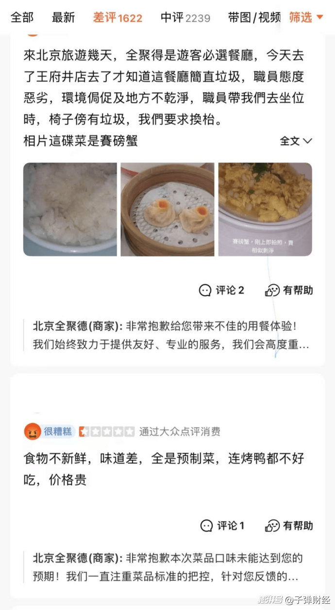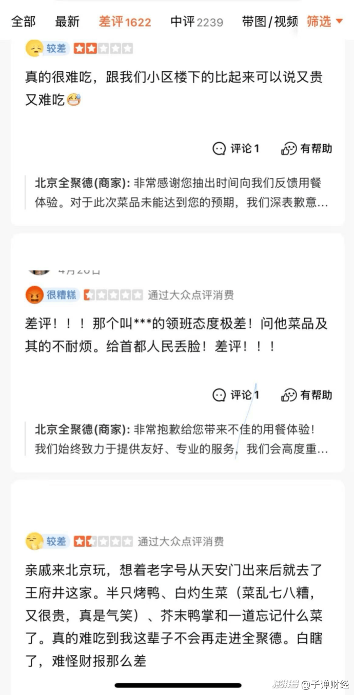 在大眾點(diǎn)評平臺上,一家位于北京的全聚德直營店差評達(dá)到1600余條,吐槽該門店價(jià)格高、環(huán)境一般、上菜慢、難吃、菜量少等。
