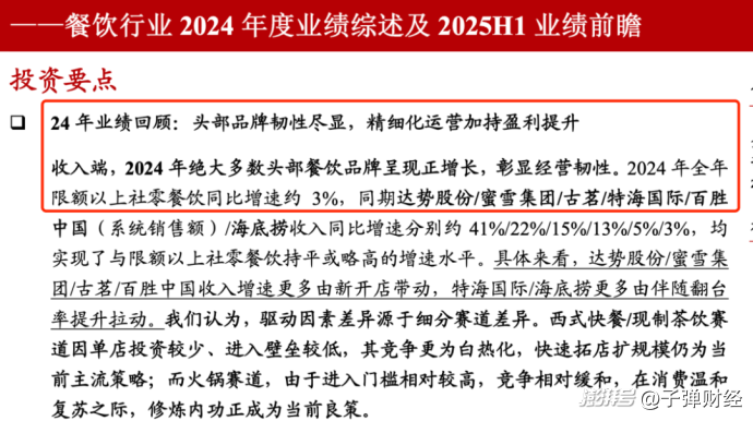 不過,餐飲行業(yè)頭部品牌表現(xiàn)強(qiáng)勁。浙商證券分析,2024年絕大多數(shù)頭部餐飲品牌呈現(xiàn)正增長,全年限額以上社零餐飲(指年主營業(yè)務(wù)收入在200萬元及以上的餐飲企業(yè)(單位)所從事的餐飲業(yè)務(wù))同比增速約3%。此外,2024年絕大多數(shù)頭部餐飲品牌實(shí)現(xiàn)盈利改善。