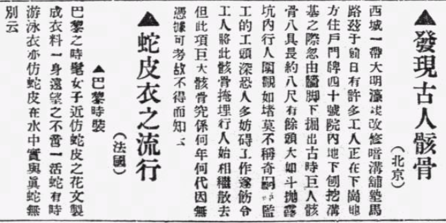 將這則報(bào)道放大,其內(nèi)容確如《長(zhǎng)狄考》一文中所述。只不過(guò)這樣一則在歷史學(xué)家眼中屬于重要古代遺跡發(fā)現(xiàn)的報(bào)道,和《蛇皮衣之流行》放在了一起。以今天的眼光看,其嚴(yán)肅性是要大打折扣的。