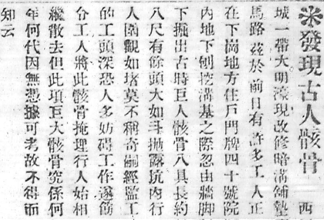 能和《用妓女做美人局——冤大頭的新聞》《籌設(shè)屠宰場(chǎng)務(wù)》《祝融敖廣決勝負(fù)——畢竟是龍王的法力大》這類(lèi)新聞放在一起,這則《發(fā)現(xiàn)古人骸骨》報(bào)道是否如呂思勉先生所認(rèn)為的“眾目昭彰,不容虛構(gòu)”,“長(zhǎng)約八尺有余,頭大如斗”的細(xì)節(jié)是否確切,要打上一個(gè)大大的問(wèn)號(hào)。